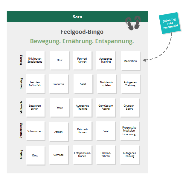 Täglich hat jedes Teammitglied die Aufgabe, fünf gesundheitsrelevante Aktionen aus den Bereichen Bewegung, Ernährung und Entspannung durchzuführen und zu protokollieren.